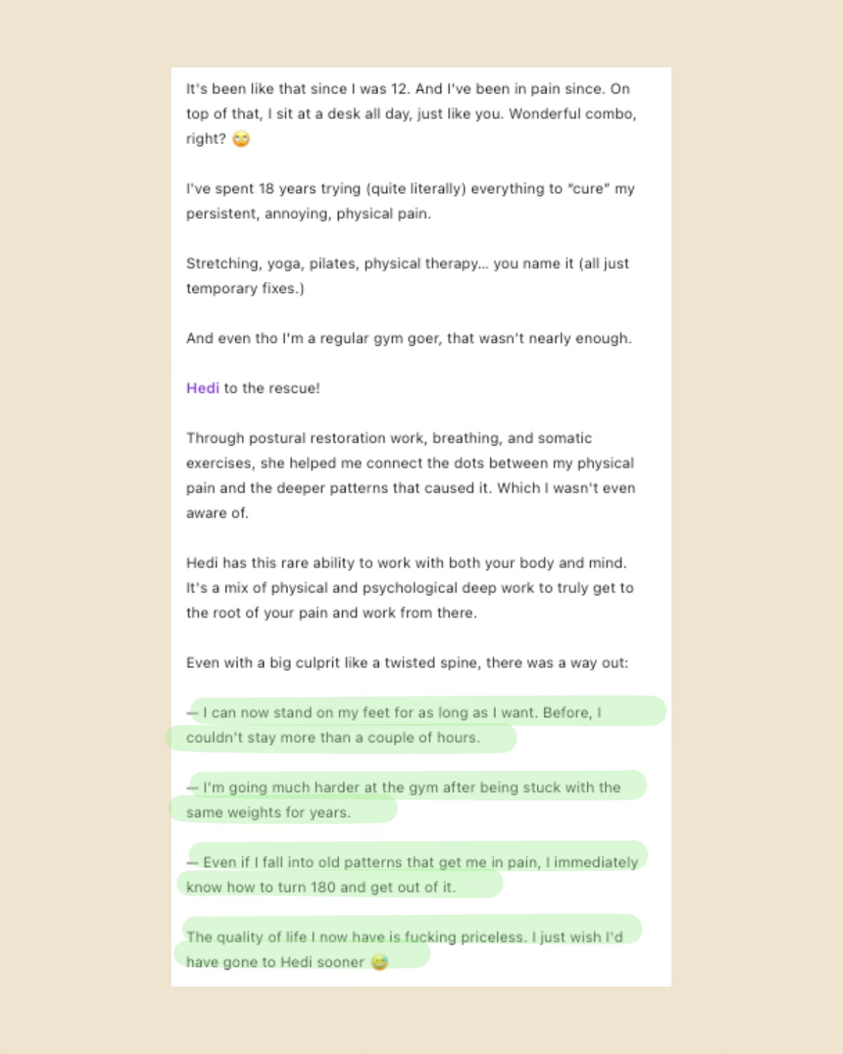 Here, I integrate nervous system work, breathwork, and posture-focused strength training to help you move beyond what keeps you stuck and in pain.