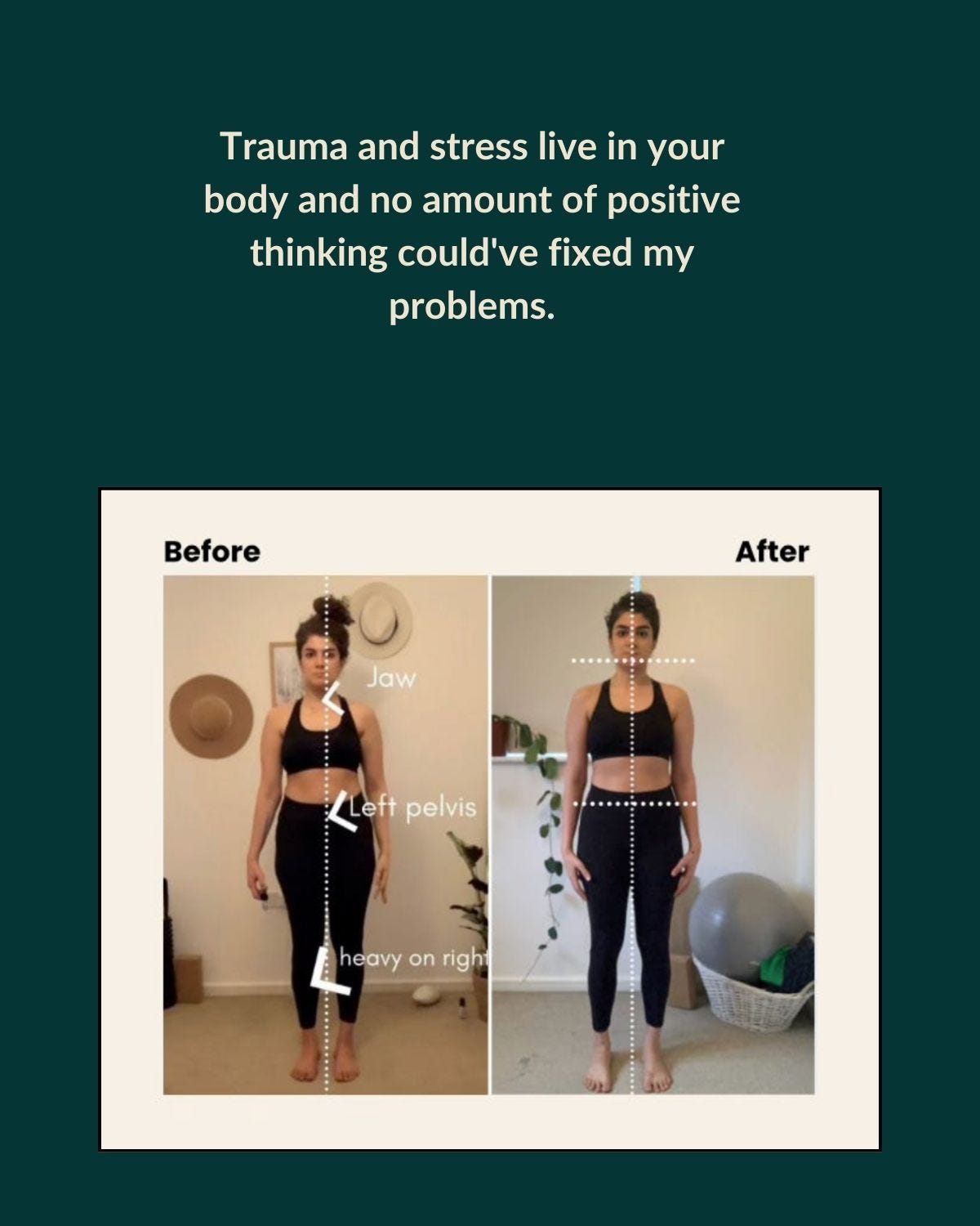 That’s why today I help people uncondition their posture through nervous system regulation, breath-work and posture-focused strength training. So that you can finally move beyond the patterns keeping you stuck and in pain. (Like mine used to.)